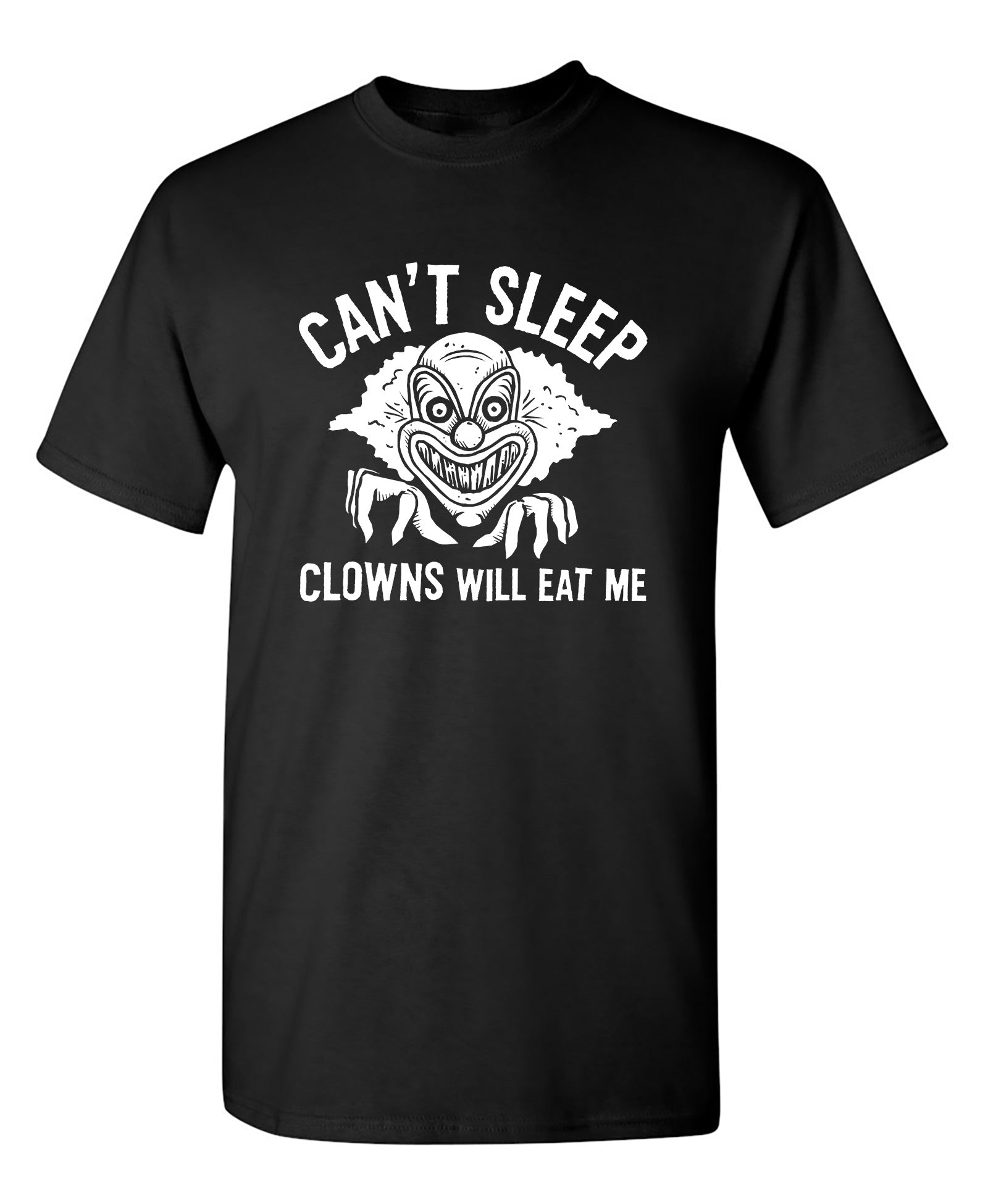 Design: Designed to tickle your funny bone, this t-shirt features a playful graphic that highlights the comical absurdity of nighttime worries. The phrase "Can't Sleep, Clowns Will Eat Me" is presented in a fun and attention-grabbing way, reminding us not to take life too seriously.